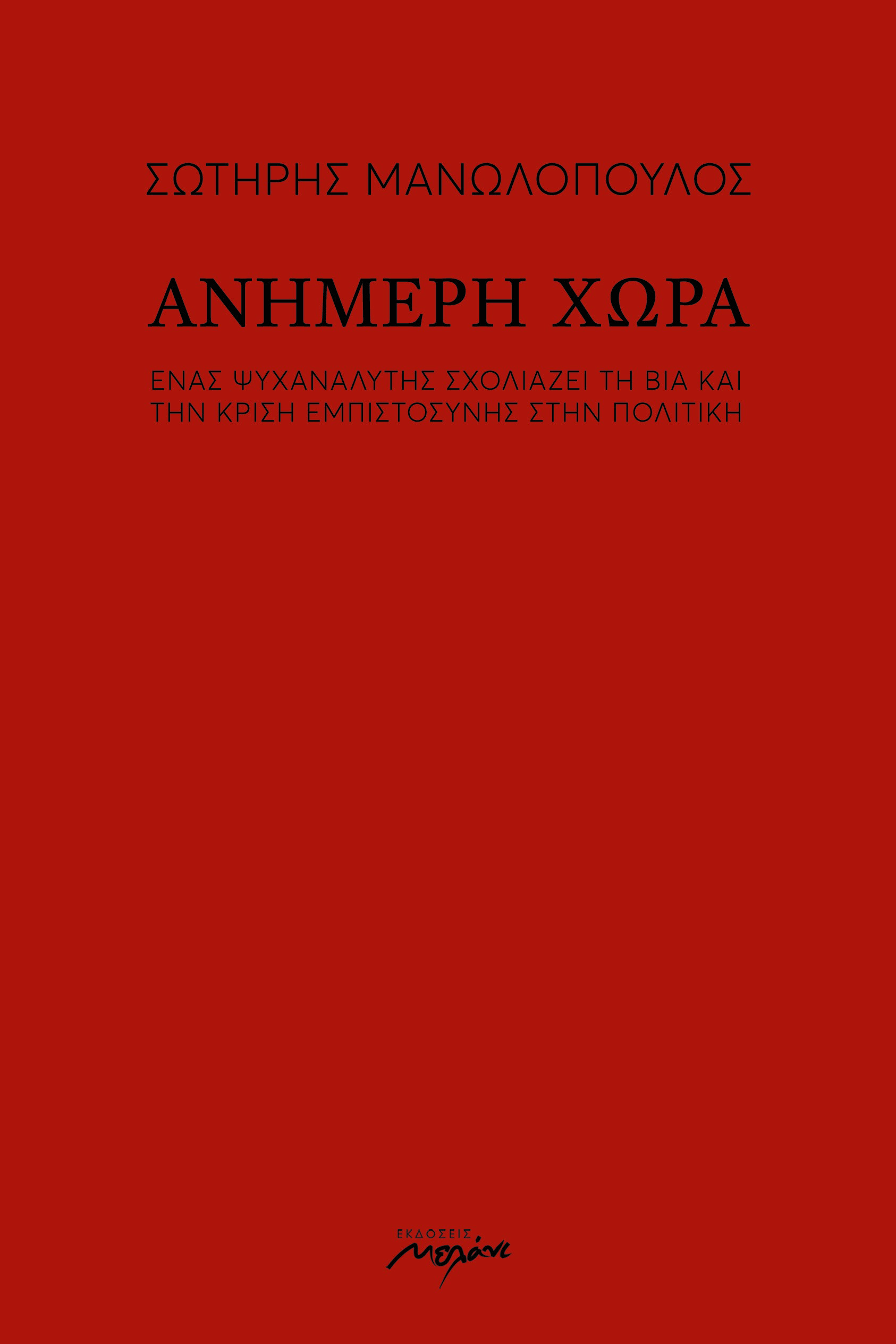 Δεν θα μπορούσα μέσα σε λίγες σελίδες να συνοψίσω τι κατορθώνει μέσα από την Ανήμερη χώρα ο Σωτήρης Μανωλόπουλος. Δεν θα ήθελα να χαλάσω και την απόλαυση της ανάγνωσης υπεραπλουστεύοντας. Μπορεί η Ανήμερη χώρα να μην είναι μυθιστόρημα, με πλοκή και χαρακτήρες, συχνά όμως η ανάγνωσή της θυμίζει κάτι τέτοιο: Θες να δεις τι γίνεται παρακάτω, πού και πώς θα το πάει ο συγγραφέας […] Η Ελλάδα, ο Έλληνας, πέρα από κρίσεις, είναι ένας αδούλευτος ψυχισμός. Μπορεί να ζει μια χαρά όταν ορισμένες βασικές εξωτερικές συνθήκες είναι ευνοϊκές, μπαλώνοντας και κουκουλώνοντας, ειδικά όταν η οικονομία έχει μια ροή. Είτε σε ένα ζευγάρι ή μια οικογένεια είτε σε μια κοινωνία, μια χώρα, η καλή οικονομία έχει ένα κοινό χαρακτηριστικό: υπνωτίζει. Σε κάνει να νομίζεις ότι τα κατάφερες. Η κακή οικονομία, όμως, κάνει όλα τα φίδια να βγαίνουν από τις φωλιές τους. Κανονικά η Ελλάδα θα έπρεπε να είχε ξαπλώσει στο ντιβάνι πολύ πριν από τα μνημόνια, από την εποχή της αστακομακαρονάδας ή και από το 1974. Μήπως και καταλάβει γιατί και πώς άφησε να γίνει, π.χ., ο Εμφύλιος ή γιατί και πώς άφησε να συμβεί η Δικτατορία.