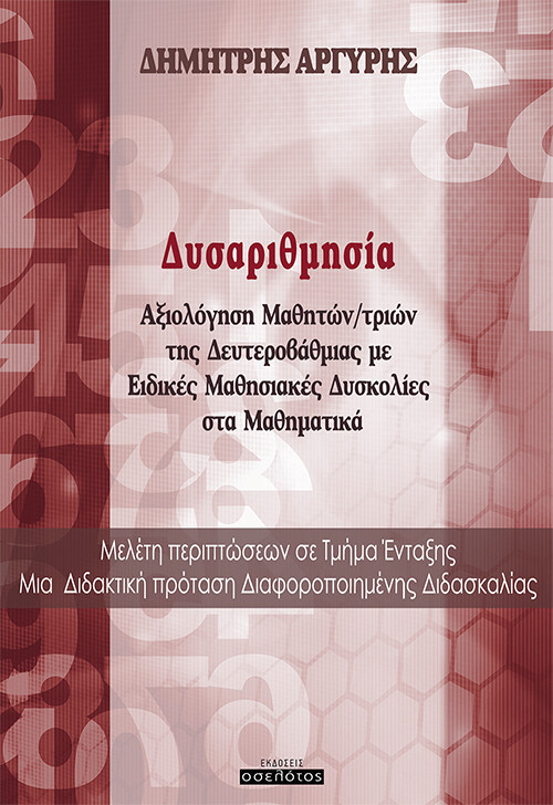 Το βιβλίο αυτό επιχειρεί να παρουσιάσει τον τρόπο ή καλύτερα τη διαδικασία αξιολόγησης μαθητών/τριών που φοιτούν σε Τμήματα Ένταξης. Στην προσπάθεια να συνδέσει τη θεωρητική προσέγγιση που έχει αναπτυχθεί μέχρι σήμερα με την εκπαιδευτική πρακτική μέσα στην τάξη, παρουσιάζονται σύντομη περιγραφή της δυσαριθμησίας και γενικά των ειδικών μαθησιακών δυσκολιών στα Μαθηματικά, το νομικό πλαίσιο για την ίδρυση και λειτουργία των Τμημάτων Ένταξης, μια έρευνα για το πώς βλέπουν οι μαθητές/τριες τα Τμήματα Ένταξης και τη λειτουργία τους, καθώς και μια έρευνα στους/στις εκπαιδευτικούς των Τμημάτων Ένταξης σχετικά με τις απόψεις τους για τη λειτουργία των Τμημάτων Ένταξης και τη συμπεριφορά των μαθητών /τριών μέσα σ’ αυτά. Παρουσιάζονται οι θεωρητικές προσεγγίσεις για τη συνολική αξιολόγηση μαθητών/τριών στο Τμήμα Ένταξης αλλά και στη Γενική Τάξη, όπως αυτές καταγράφονται μέσα από τη μελέτη 4 περιπτώσεων (2 μαθητών και 2 μαθητριών) ενός Τμήματος Ένταξης, στο οποίο υλοποιείται διδακτική παρέμβαση, ακολουθώντας τις κατάλληλες τεχνικές της διδακτικής διαφοροποίησης.