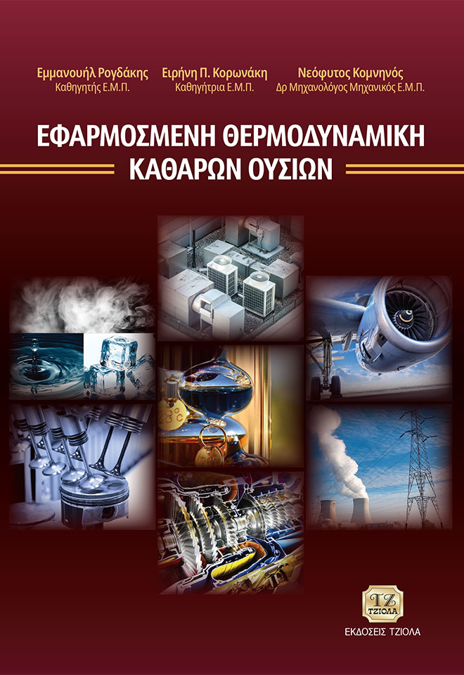 Περιέχει: Βασικές Έννοιες – Μηδενικός και Πρώτος Θερμοδυναμικός Νόμος – Δεύτερος Θερμοδυναμικός Νόμος – Τέλειο Αέριο – Βασικοί Θερμοδυναμικοί Κύκλοι Τελείων Αερίων – Κινητήρες Stirling και Ericsson – Σχέσεις Μεταξύ Θερμοδυναμικών Ιδιοτήτων – Θερμοδυναμικά Δυναμικά – Καταστατική Εξίσωση van der Waals – Καταστατικές Εξισώσεις Ανώτερης Τάξης – Θερμοδυναμικές Ιδιότητες Ρευστών – Θεωρία Υδρατμών – Κύκλος Rankine – Εξέργεια – Θερμοδυναμική Συμπιεστού Ρευστού – Ψυκτικοί Κύκλοι – Ψυκτικά Συστήματα – Προωστικά Συστήματα Αεροσκαφών Και Διαστημικών Σκαφών – Συμπληρωματική Ενότητα – Ευρετήριο