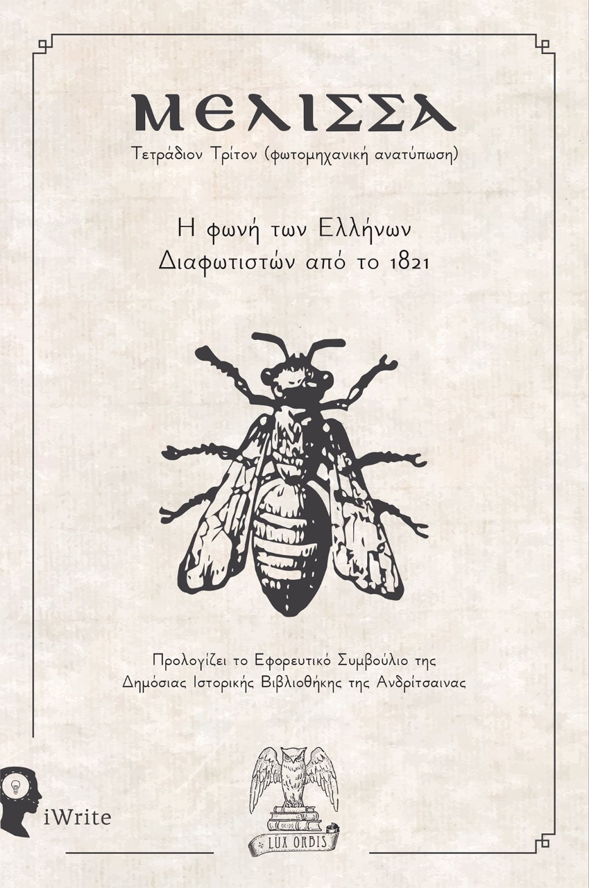 Είναι γεγονός πως η συμπλήρωση δύο αιώνων από το ξέσπασμα της Ελληνικής Επανάστασης, αύξησε κατακόρυφα το ενδιαφέρον του αναγνωστικού κοινού για μελέτες και αναγνώσματα σχετικά με την περίοδο του 1821. Κυκλοφόρησαν εκατοντάδες βιβλία με αξιοπρόσεκτες αναλύσεις πολλών σύγχρονων ειδικών επάνω στο φαινόμενο της προετοιμασίας, της γέννησης και της κληρονομιάς του Αγώνα, καθώς επίσης και αρκετές επανατυπώσεις απομνημονευμάτων των ηρώων της εποχής, αλλά και έργων των πρώτων Ιστορικών του ελληνικού κράτους, από το δεύτερο μισό του 19ου αιώνα και εξής. Παρ’ όλα αυτά, η εικόνα που έχουμε για τη διακίνηση των ιδεών, μέσα από κείμενα που ουσιαστικά συμπίπτουν με την έναρξη της Επανάστασης, είναι μάλλον αρκετά θολή. Διακόσια χρόνια μετά, η σειρά Lux Orbis των εκδ. iWrite, σε συνεργασία με τη Δημόσια Ιστορική Βιβλιοθήκη της Ανδρίτσαινας, φέρνει στο φως έναν πραγματικό πνευματικό θησαυρό. Η επανακυκλοφορία του τρίτου τεύχους του περιοδικού «Μέλισσα» (εκδοθέν το 1821 στο Παρίσι), λειτουργεί σαν μία πρώτης τάξεως εκδοτική χρονοκάψουλα, μεταφέροντας στον αναγνώστη τις σκέψεις και τις επιδιώξεις των Ελλήνων Διαφωτιστών της εποχής, με προεξέχουσα μορφή τον Κωνσταντίνο Αγαθόφρωνα Νικολόπουλο. Οι αυθεντικές αυτές καταγραφές των ριζοσπαστών Ελλήνων στοχαστών του ’21, που εμπνέονταν από τις ιδέες του Αδαμάντιου Κοραή, έρχονται σήμερα να μεταβάλουν σε μεγάλο βαθμό την εικόνα που έχουν πολλοί σύγχρονοι Νεοέλληνες για μια σειρά από ζητήματα, ανάμεσα στα οποία και η στάση της ανώτατης ιεραρχίας της Εκκλησίας απέναντι στον φωτισμό και την απελευθέρωση του υποδουλωμένου Έθνους.