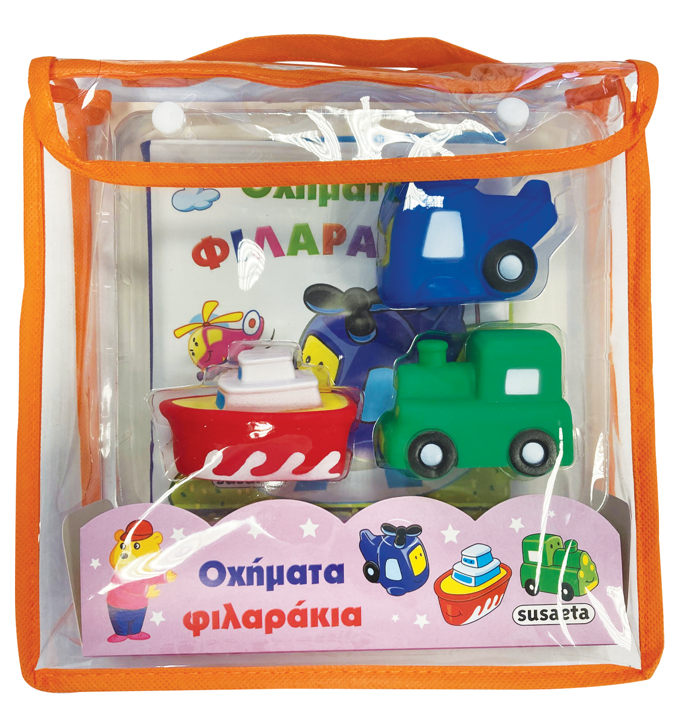 Ξεφυλλίστε στο μπάνιο μαζί με το παιδί σας το χαρούμενο βιβλίο με τα στιχάκια και παίξτε με τα αδιάβροχα οχήματα που περιλαμβάνονται στο τσαντάκι.