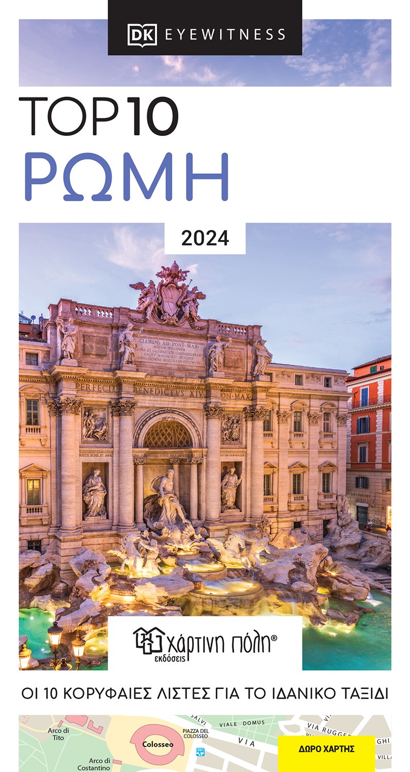 Το Βατικανό, το Πάνθεον, η πινακοθήκη Μποργκέζε, το Κολοσσαίο, η Σάντα Μαρία ντελ Πόπολο και τα υπόλοιπα ιστορικά αξιοθέατα της Ρώμης. Όλες οι πληροφορίες που χρειάζεστε για να οργανώσετε το τέλειο ταξίδι! Πλήρως ανανεωμένος και εμπλουτισμένος με ό,τι καλύτερο έχει να προσφέρει η Ρώμη είναι ο ταξιδιωτικός οδηγός TOP10 Ρώμη της καταξιωμένης Αγγλικής εκδοτικής εταιρίας DK EYEWITNESS TRAVEL. Ο οδηγός περιλαμβάνει, χρήσιμες και έγκυρες πληροφορίες και συμβουλές, ευρετήρια, τοπικό λεξιλόγιο, καθώς και λεπτομερείς χάρτες και πλούσιο φωτογραφικό υλικό. Περιέχει δώρο, αποσπώμενο χάρτη της πόλης.